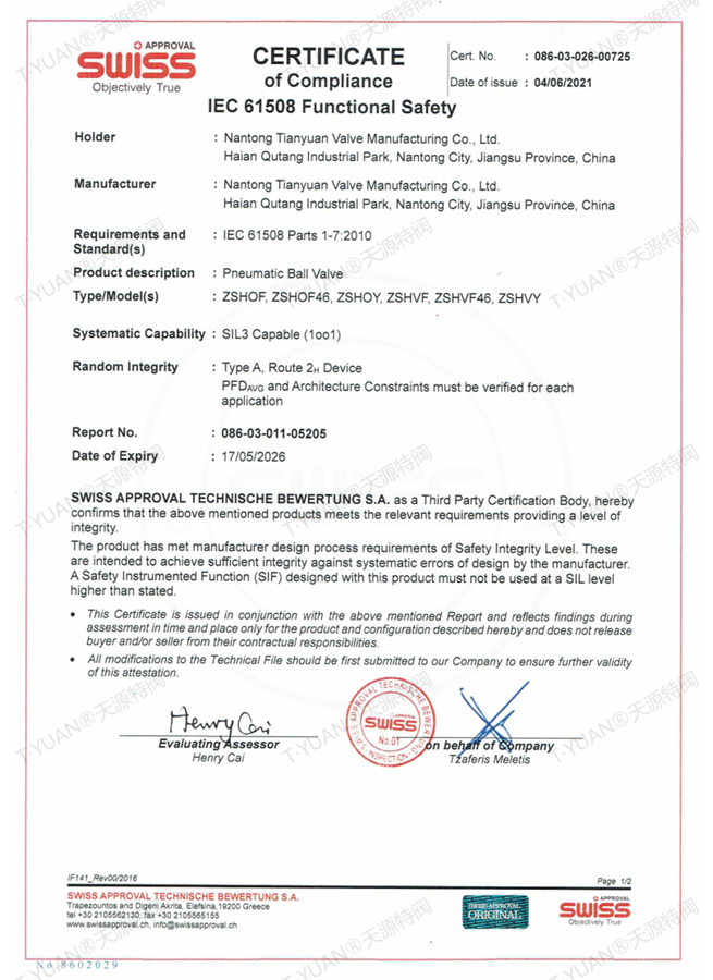 SIL认证证书-切断球阀1